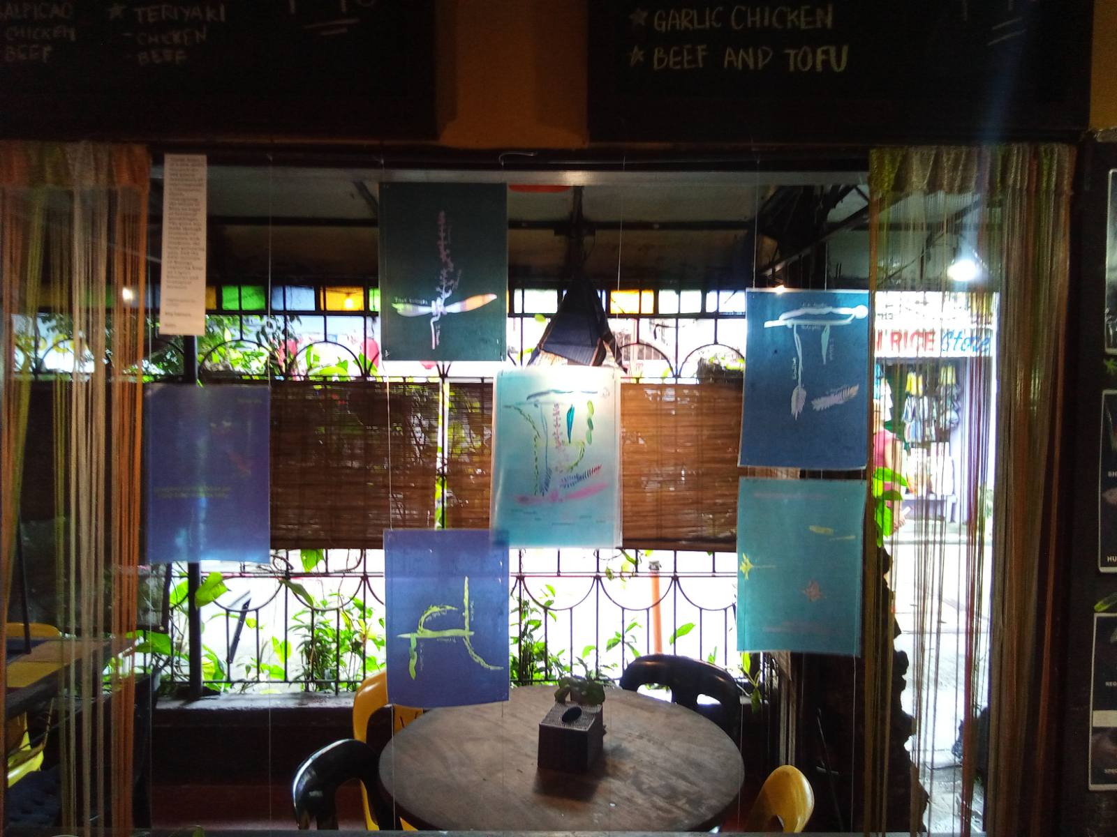 The project began with the name Krus na Ligas itself, which references a cross-shaped Ligas tree that once grew in the area. The artwork transforms the roads of Krus na Ligas into ghostly, surreal forms that evoke botanical specimens and x-rays. Rendered in a cyanotype-like style and fragmented into glyphs, the maps are suspended on acetate over a window at Carinderia Sefali. This allows sunlight or the restaurant's lights to illuminate them like lightboxes. A bundle of them are stacked on each other, so the glyphs layer on each other to form the map of Krus na Ligas's roads, which can be flipped through. The blue backgrounds also reference the protective talismans of Mediterranean and Middle Eastern cultures, imbuing the maps with a magical, protective function.